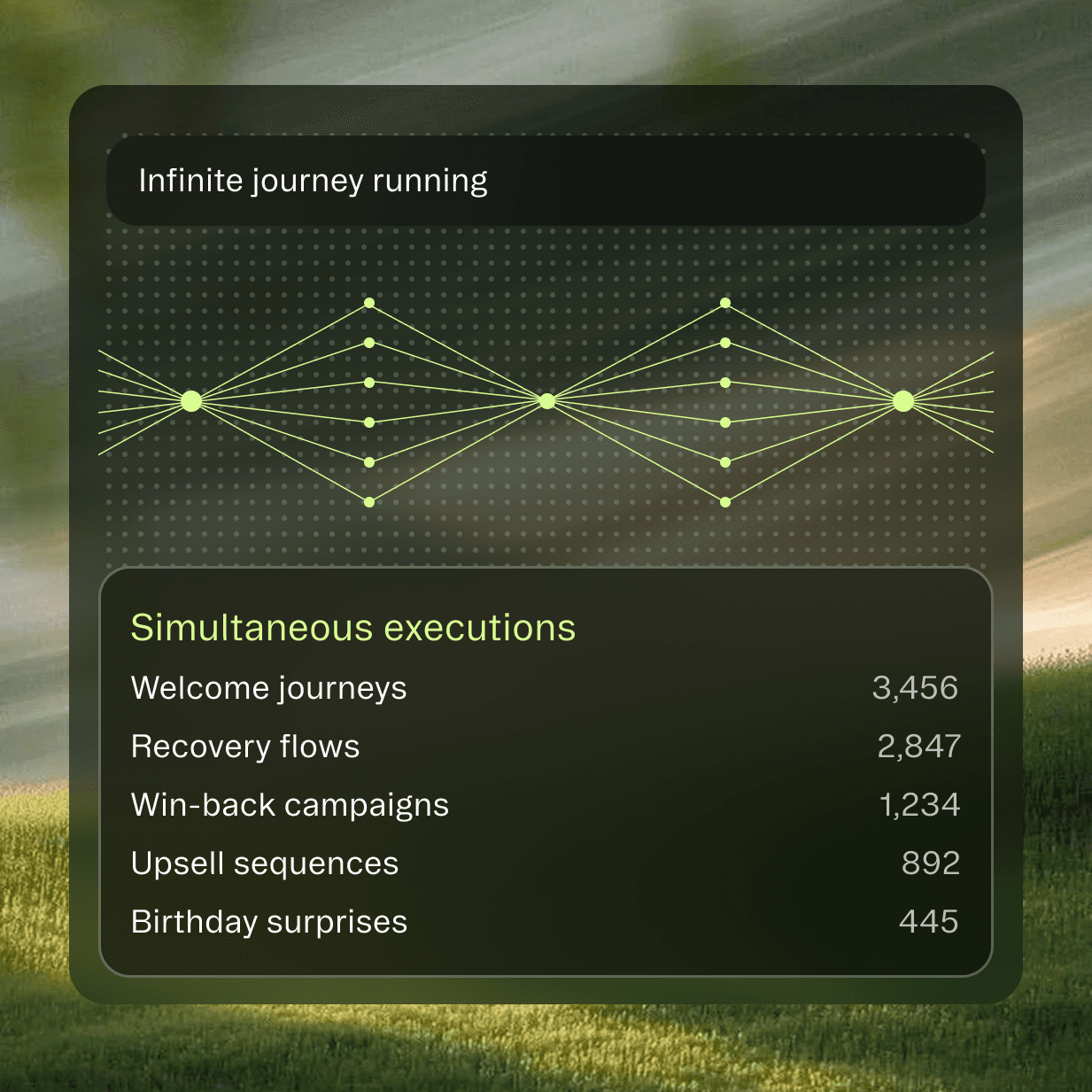 Watch as thousands of individual journeys run simultaneously. Each customer experiencing perfectly timed, contextually relevant campaigns that feel personally crafted.
