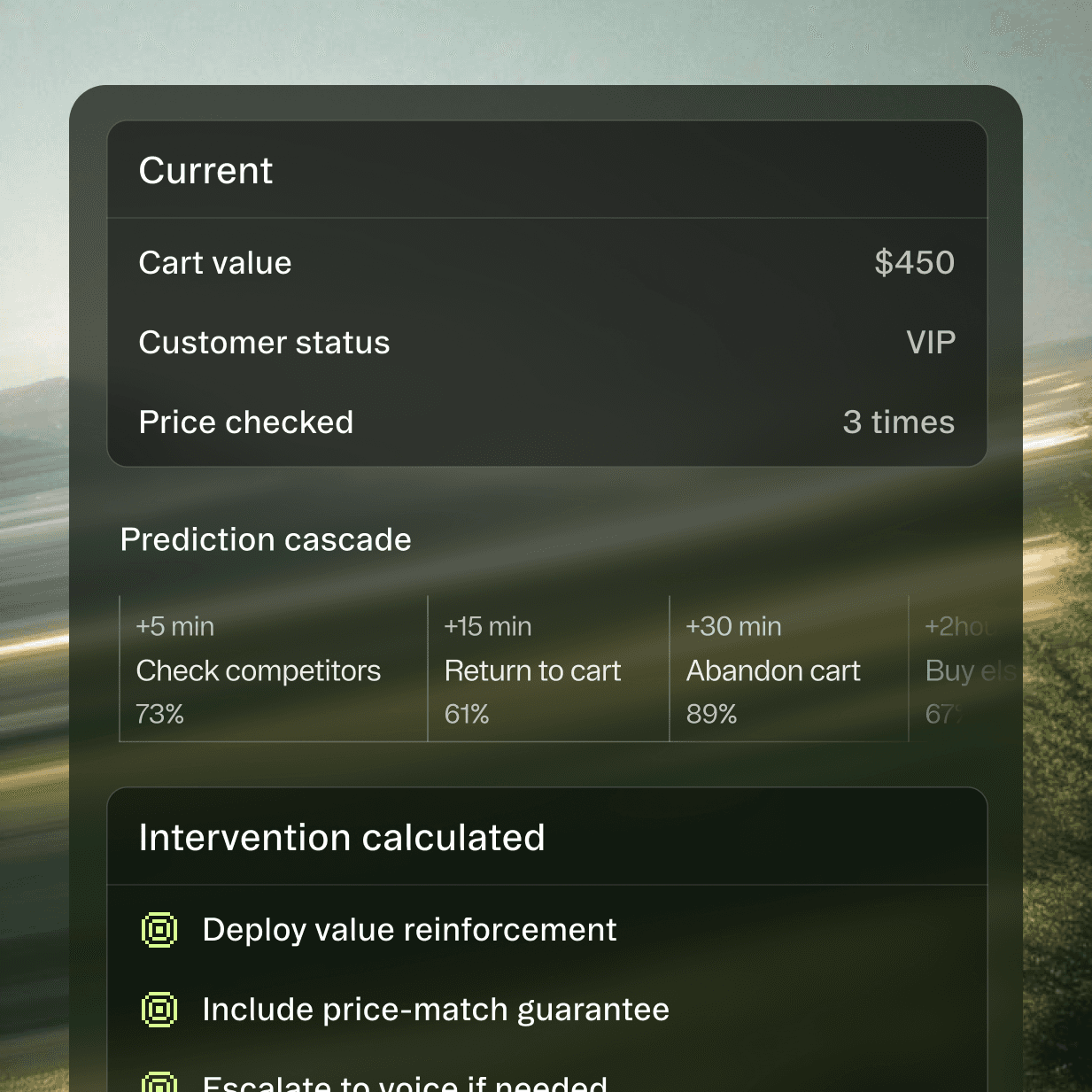 Detect abandonment signals 10-30 seconds early. Intervene while visitors are still engaged.