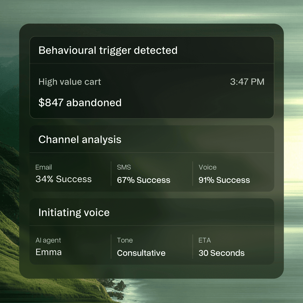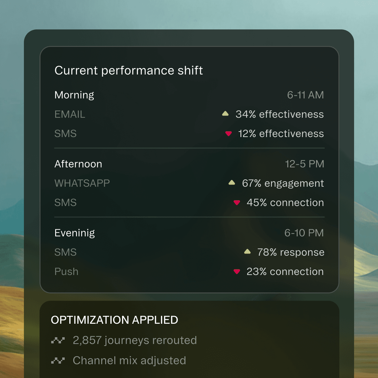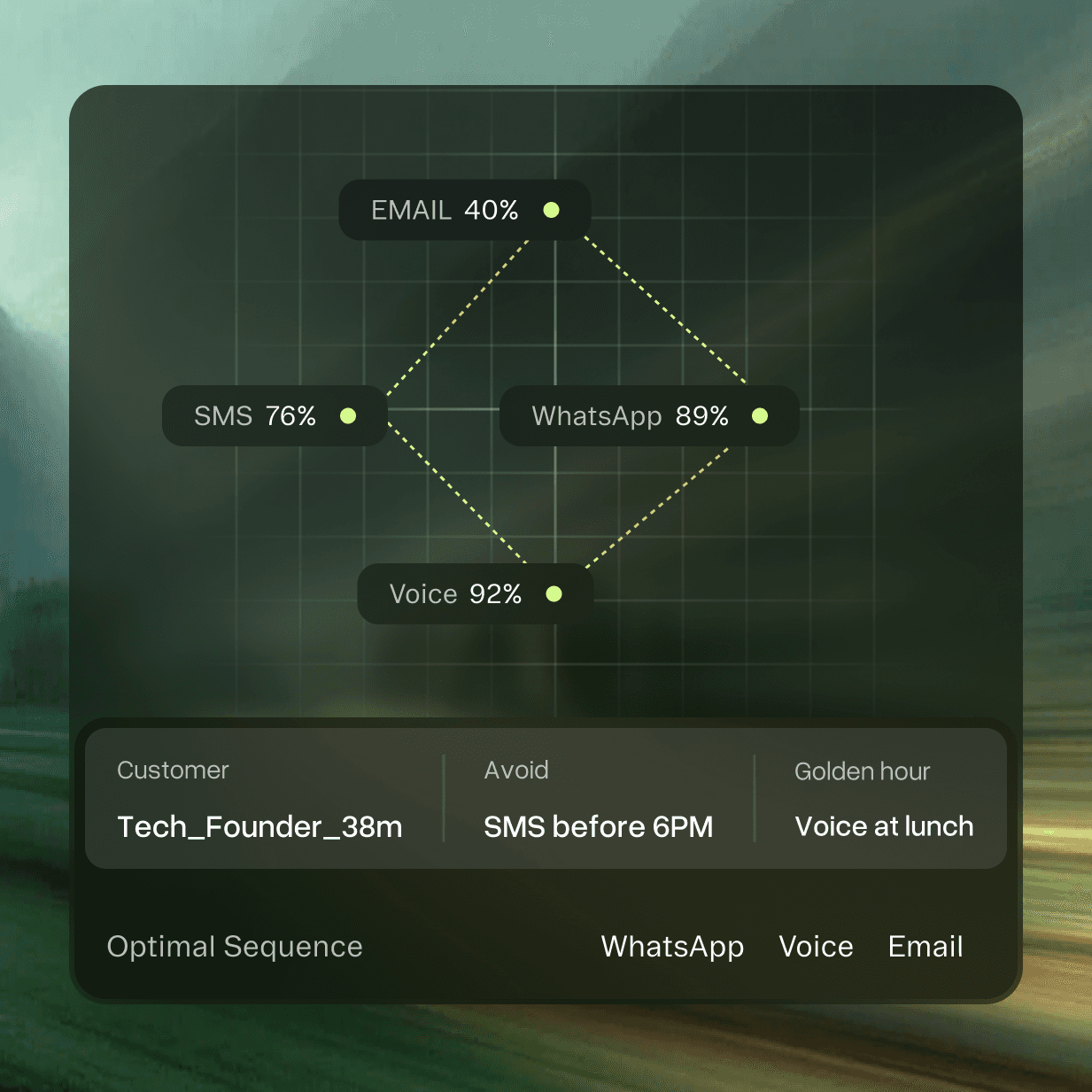 See channel effectiveness 30 seconds ahead. Our sub-1MB AI predicts with 89% accuracy which channel will convert, automatically switching from SMS to Voice when detecting purchase hesitation, or from Email to WhatsApp when urgency peaks.