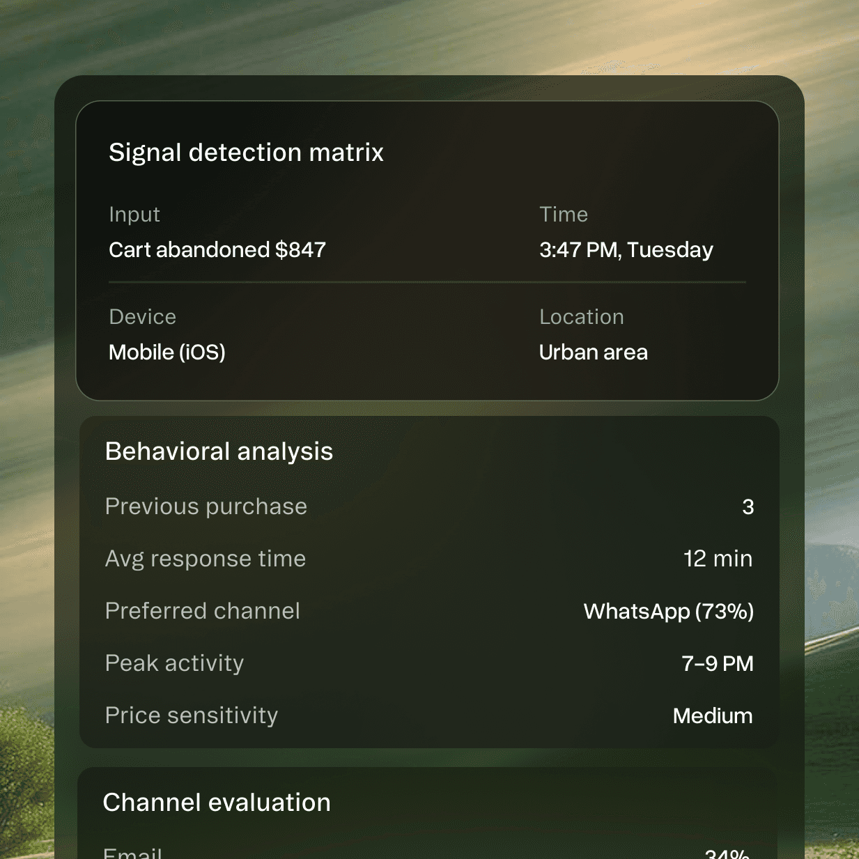 Type or observe customer behavior. The AI agent instantly evaluates all available channels, analyzing past preferences, current context, and predicted effectiveness.