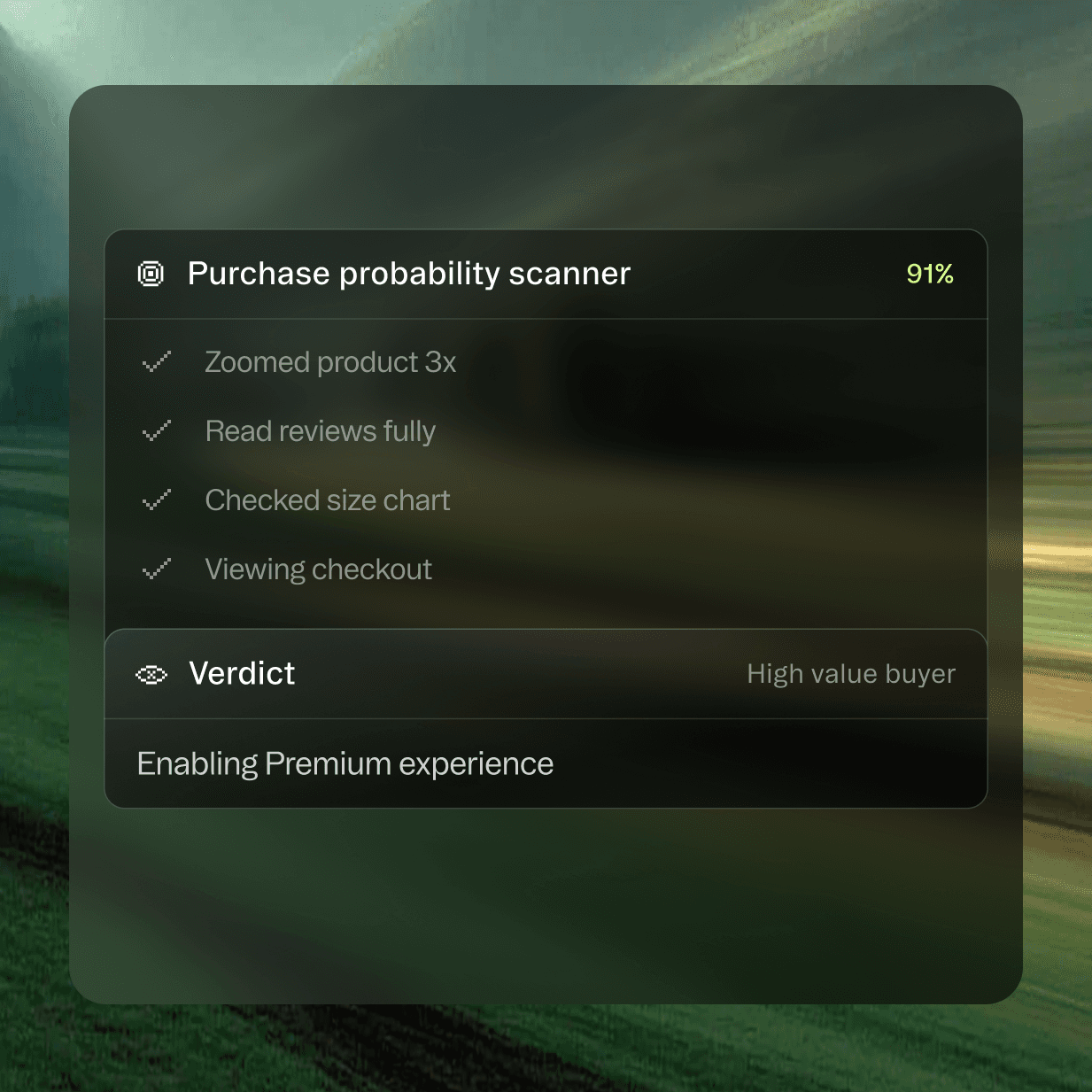 Our AI detects pre-abandonment signals–cursor drift, scroll deceleration, tab switching patterns–with 73% accuracy. Trigger the perfect intervention while they're still engaged. One client reduced abandonment by 47% by acting on predictions instead of reacting to exits.