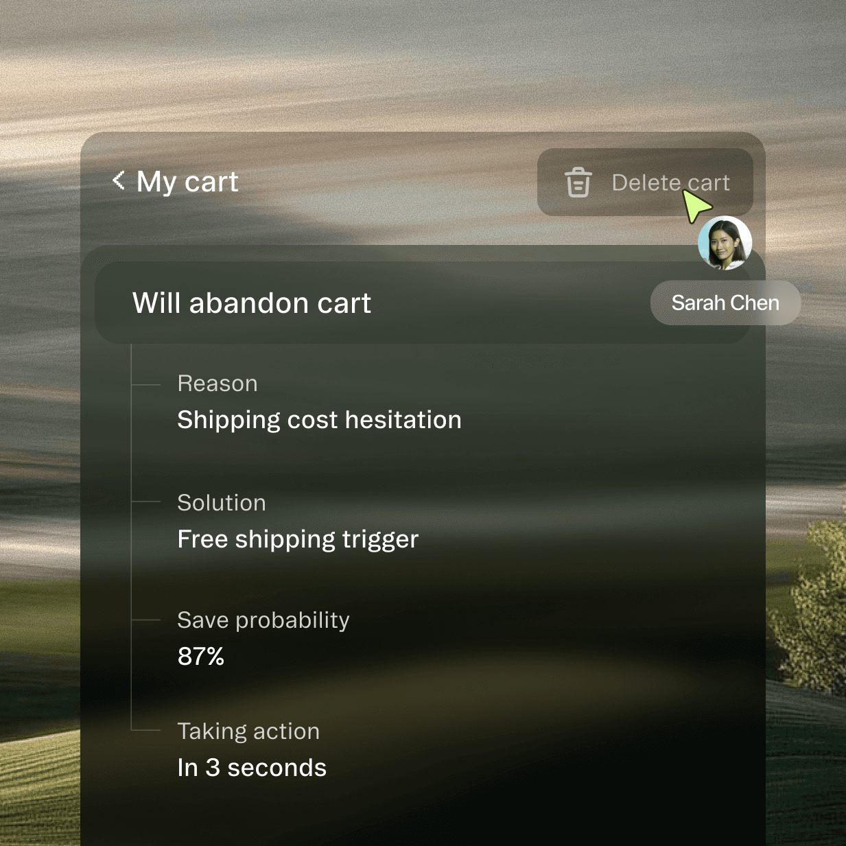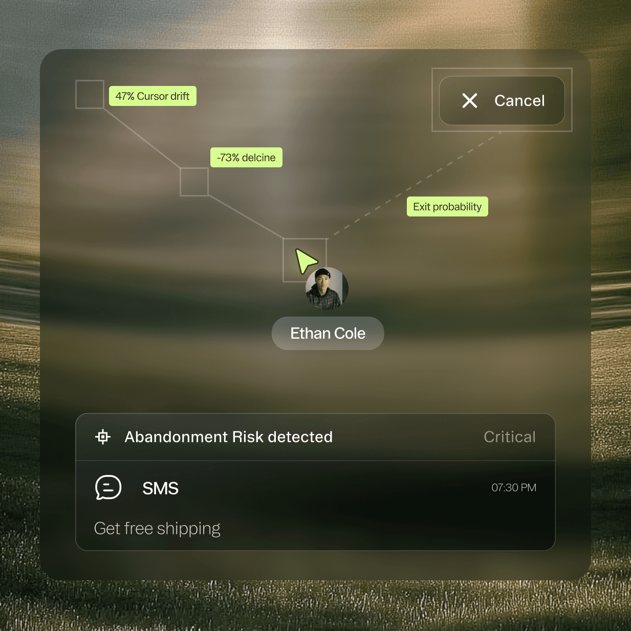 Our AI detects pre-abandonment signals—cursor drift, scroll deceleration, tab switching patterns—with 73% accuracy.