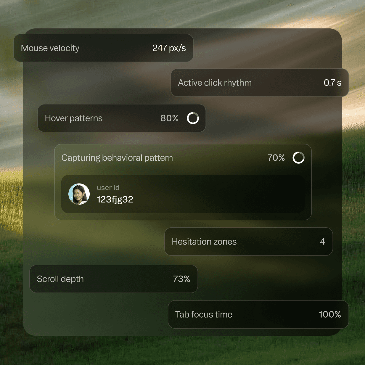 Our edge AI captures 384 micro-signals per second mouse velocity, scroll patterns, hesitation points building a real-time behavioral fingerprint.