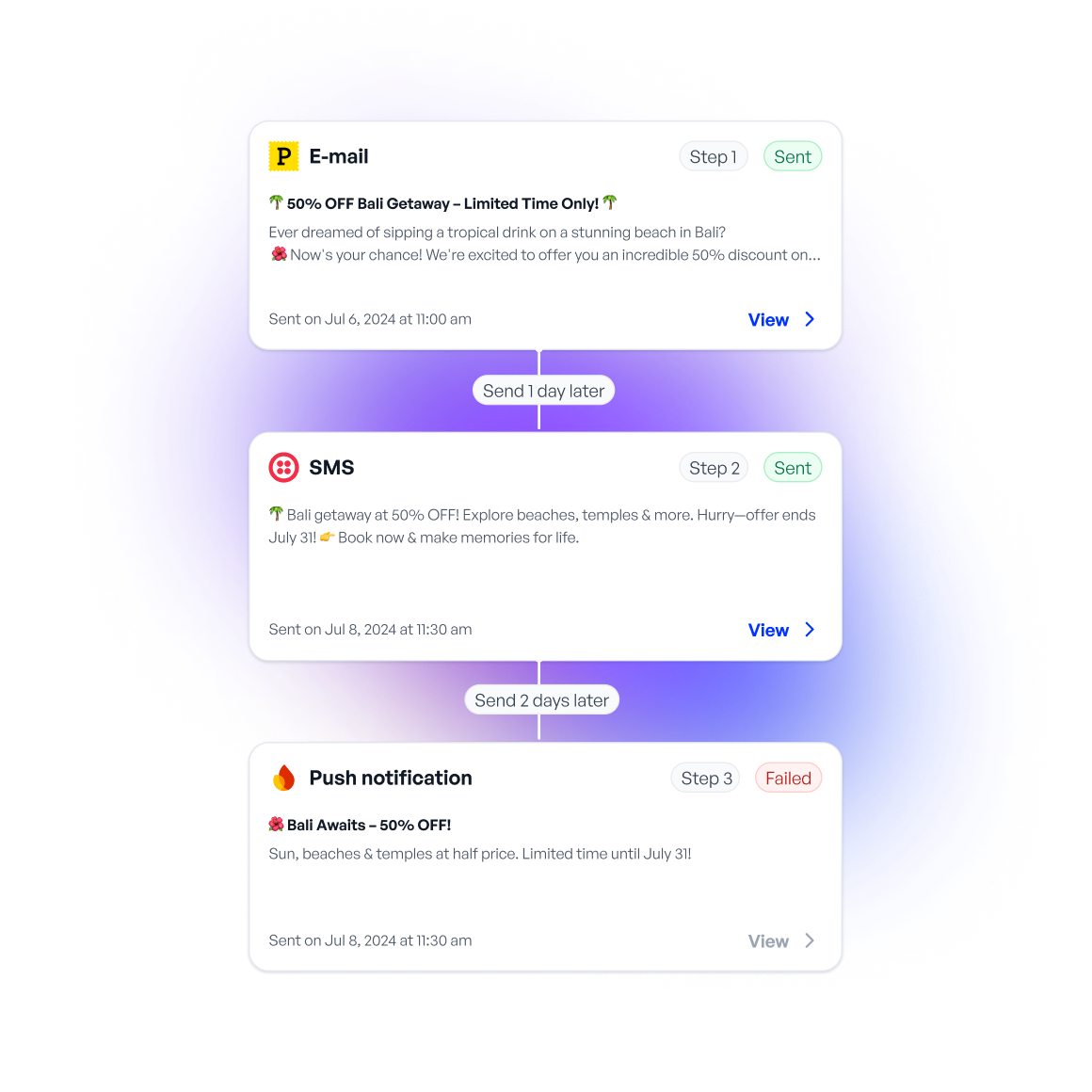 Manages escalation timing from email to SMS to WhatsApp to voice calls