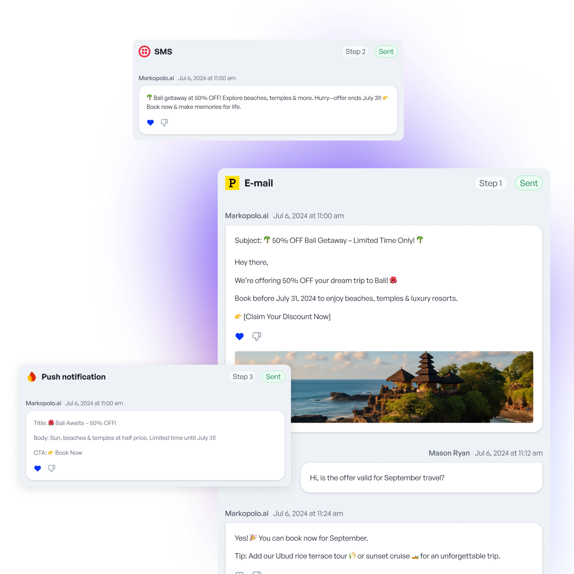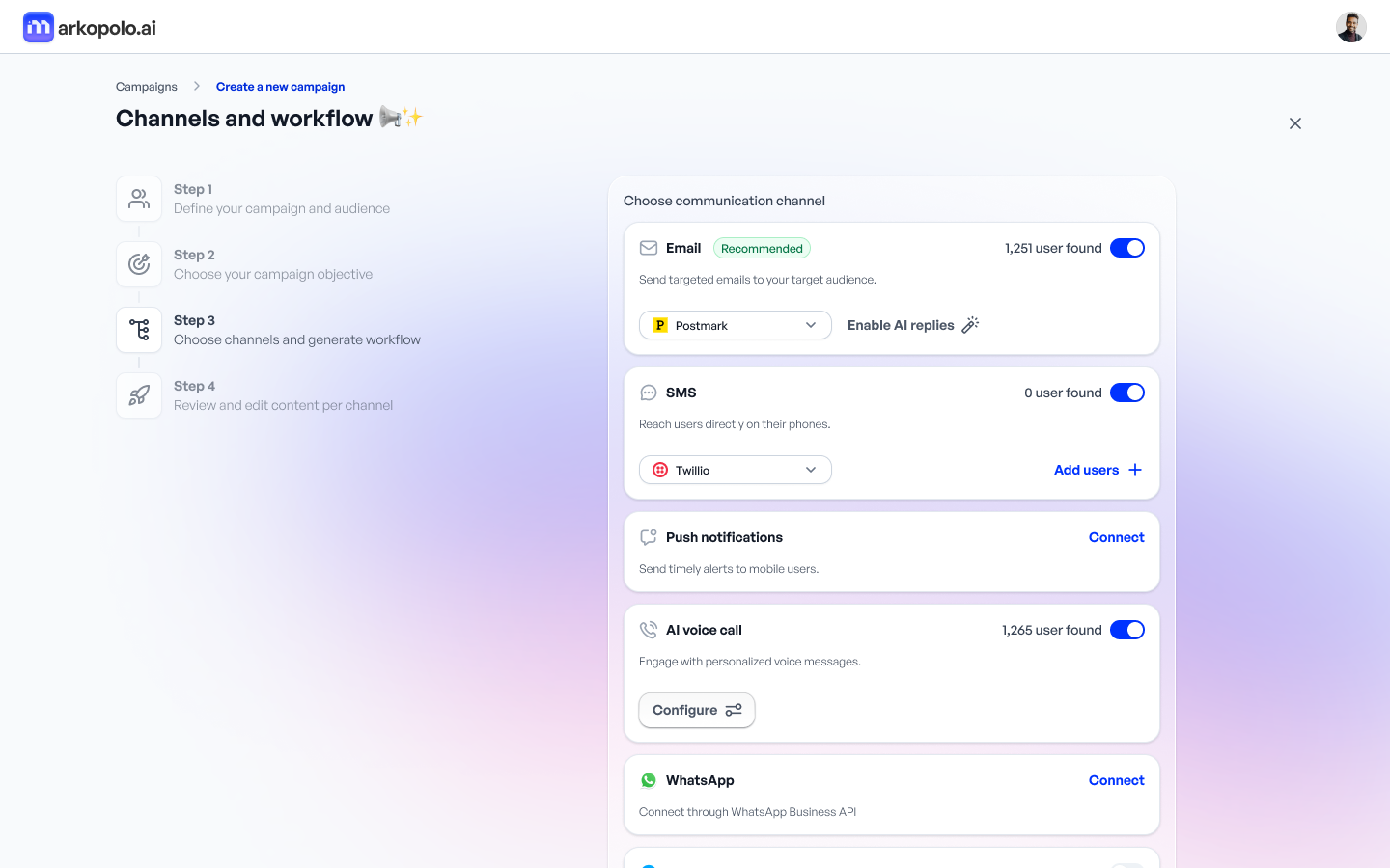 Markopolo campaign agent covers the entire customer lifecycle, from acquisition via voice calls, activation inside the web or app, to retention and upselling via multi-channel campaigns.